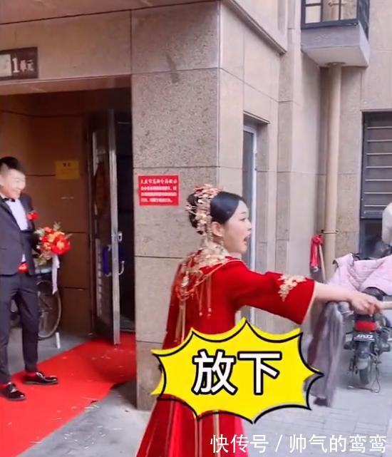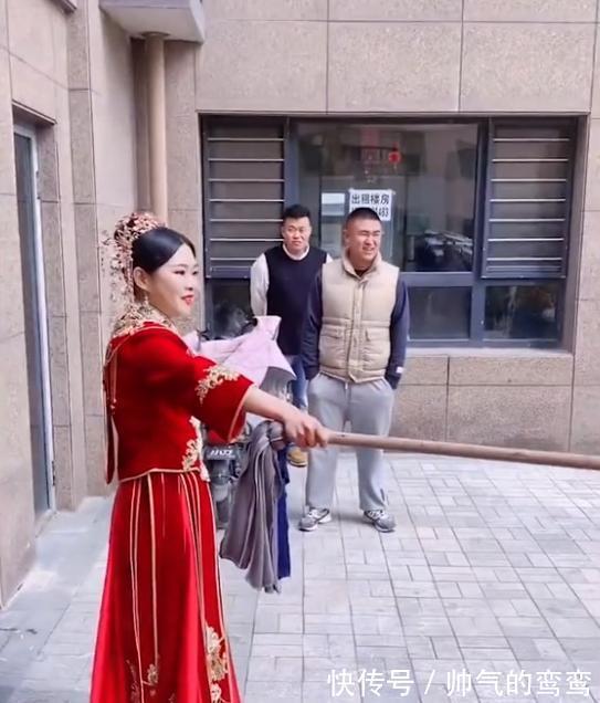 近日,黑龙江大庆。网友分享了一则有趣的视频,视频一对新人正在结婚,按照当地的习俗,新郎是需要被亲朋好友“抽打”的。但是呢,因为新娘心疼丈夫,于是就让丈夫躲进楼里面,而她自己则拿着一根拖把霸气护夫称:“我看谁敢上来。”